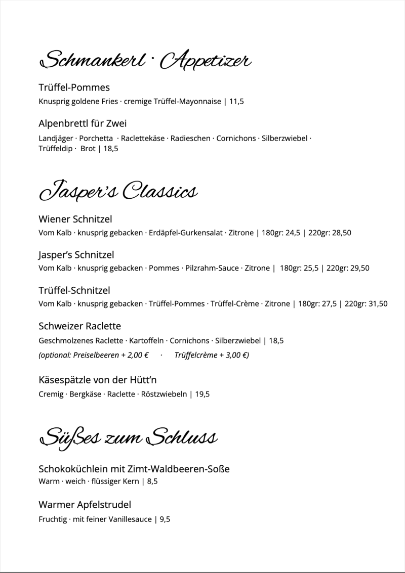 Die Küche des Jasper's offeriert Klassiker und neue Kreationen der süddeutschen & österreichischen Genusskultur.